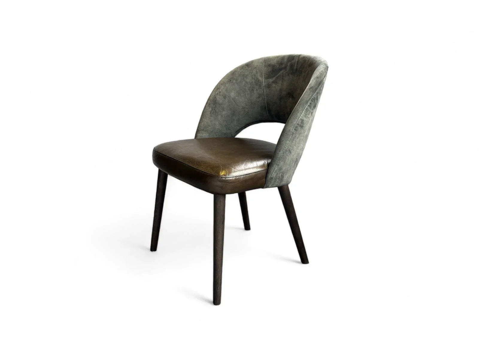 Scaunul Dex impresionează printr-un design sofisticat, potrivit pentru spații elegante, restaurante, birouri sau zone de dining. Construit pe o structură din lemn masiv de fag, acest model oferă stabilitate și durabilitate, fiind completat de o tapițerie deosebită: piele naturală de bivol pe șezut și catifea fină pe spătar.